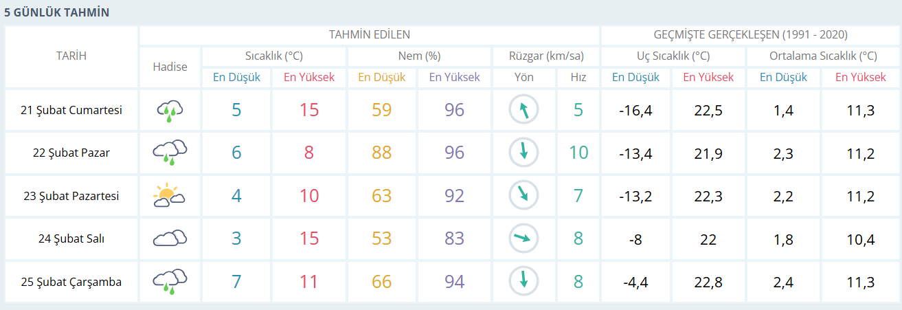 Beş günlük tahmine bakıldığında ise yağışlı ve serin havanın aralıklarla etkisini sürdüreceği görülüyor. Haftanın ilk gününde en düşük sıcaklık 5, en yüksek sıcaklık 15 derece civarında beklenirken nem oranı yüksek seyrediyor ve sağanak geçişleri öne çıkıyor. Pazar günü sıcaklıkların düşerek 6–8 derece aralığında kalması ve yağışın devam etmesi öngörülüyor. Pazartesi günü parçalı bulutlu bir gökyüzüyle birlikte sıcaklıkların 10 dereceye kadar yükselmesi bekleniyor. Salı günü yeniden 15 dereceye ulaşan değerler dikkat çekerken bulutlu bir hava tahmin ediliyor. Çarşamba günü ise yağışın tekrar etkili olması ve sıcaklıkların 7 ila 11 derece arasında değişmesi bekleniyor.