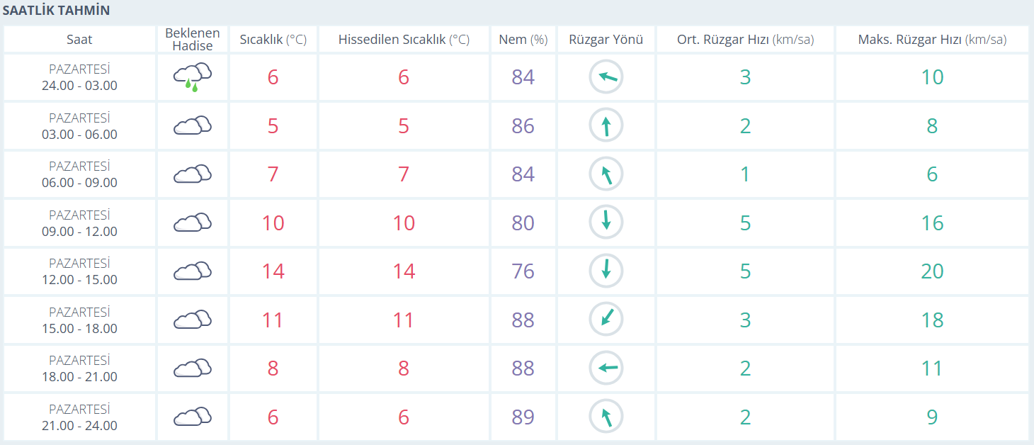 Bursa’da yeni haftaya bulutlu bir gökyüzüyle giriliyor. Günün ilk saatlerinde yer yer hafif yağmur görülürken, ilerleyen saatlerde bulutluluk etkisini sürdürüyor. Sabah 5–7 derece civarında seyreden sıcaklık öğle saatlerine doğru yükselerek 14 dereceye kadar çıkıyor. Nem oranı gün boyu yüksek, rüzgâr ise genellikle hafif ve zaman zaman orta kuvvette esiyor. Akşam saatlerinden itibaren sıcaklık yeniden düşüşe geçerek gece saatlerinde 6–8 derece seviyelerine iniyor.