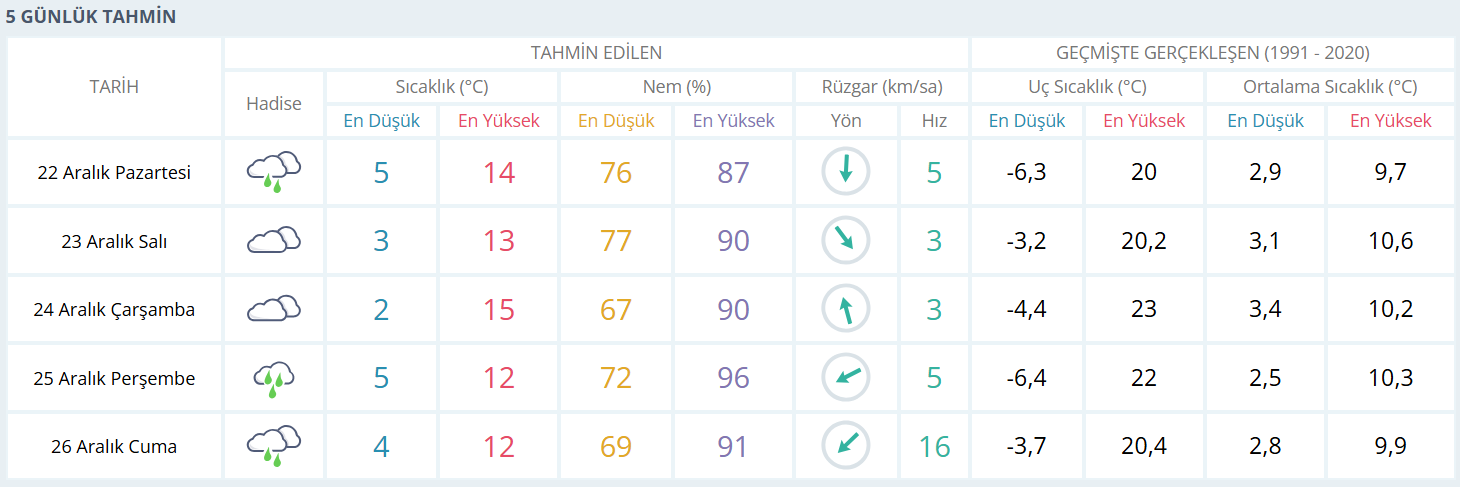 Hafta genelinde Bursa’da parçalı ve çok bulutlu hava hakim olacak. Salı ve çarşamba günleri yağış beklenmezken sıcaklıklar gece saatlerinde 2–3 dereceye kadar düşüyor, gündüzleri ise 13–15 derece aralığında seyrediyor. Perşembe günü yağmur yeniden etkili olurken, hava sıcaklığı 12 derece civarında kalıyor. Cuma günü de yer yer yağış görülmesi bekleniyor. Genel olarak hafta boyunca mevsim normallerine yakın, nem oranı yüksek ve zaman zaman yağışlı bir hava Bursa’da etkisini gösterecek.