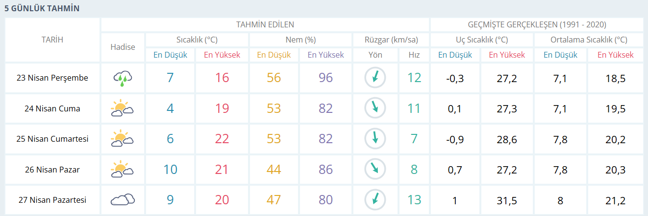 Önümüzdeki 5 günlük süreçte ise Bursa’da bahar havası hakim olacak. Perşembe günü yağış geçişlerinin ardından cuma gününden itibaren güneş yüzünü daha fazla gösteriyor. Sıcaklıklar kademeli olarak artarak hafta sonu 22 dereceye kadar çıkıyor. Gece saatlerinde ise serinlik hissedilmeye devam ederken, en düşük sıcaklıkların 4 ila 10 derece arasında değişmesi bekleniyor. Nem oranının zaman zaman yüksek seyredeceği kentte rüzgarın genellikle hafif ve orta kuvvette esmesi öngörülüyor. Yeni haftanın ilk gününde ise parçalı bulutlu bir hava ile birlikte sıcaklıkların 20 derece civarında seyretmesi tahmin ediliyor.