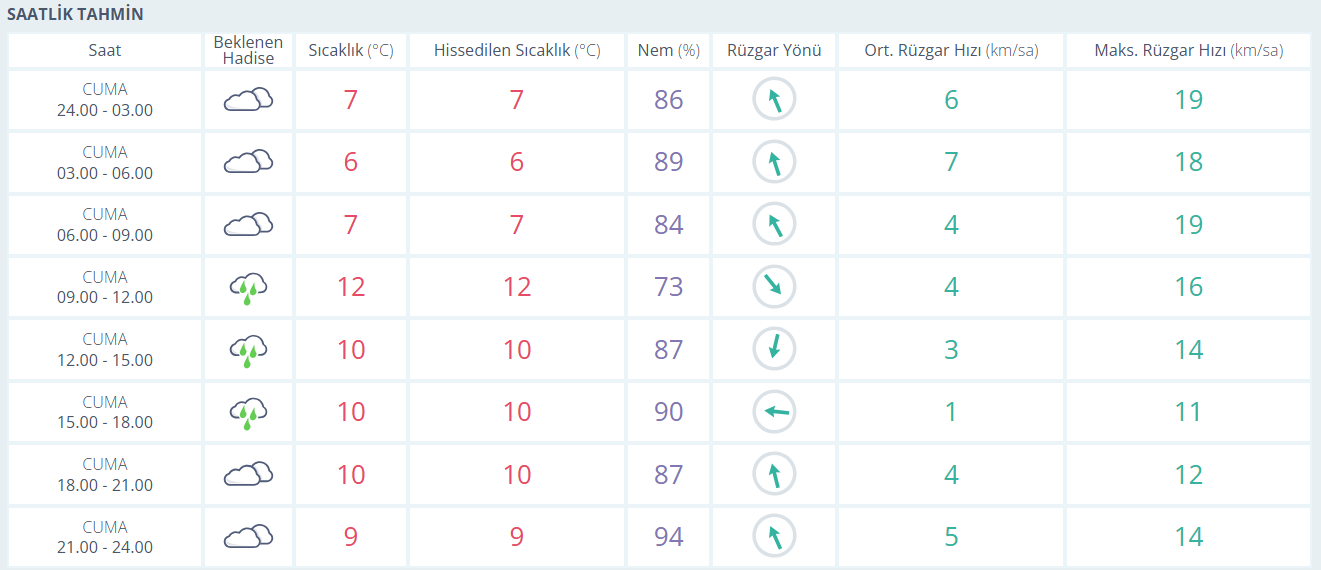 Bursa’da bugün hava genel olarak bulutlu ve yağışlı bir seyir izliyor. Gece saatlerinden sabaha kadar çok bulutlu bir gökyüzü hâkim olurken sıcaklık 6–7 derece civarında ölçülüyor. Sabahın ilerleyen saatleriyle birlikte sıcaklık yükselişe geçiyor ve öğleye doğru yağmur etkisini gösteriyor. Günün en yüksek sıcaklığı 12 dereceye ulaşırken nem oranı oldukça yüksek seyrediyor. Öğle ve öğleden sonra saatlerinde aralıklarla devam eden yağışlar akşam saatlerine doğru etkisini kaybediyor. Gün boyunca rüzgâr genellikle hafif ve orta kuvvette, zaman zaman yön değiştirerek hissediliyor. Akşam saatlerinde sıcaklık 9–10 dereceye gerilerken nem oranı artıyor ve hava yeniden çok bulutlu bir hal alıyor.