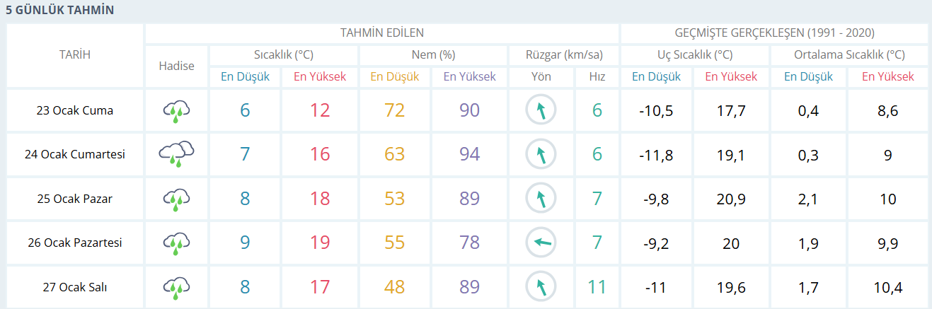 Önümüzdeki beş günlük süreçte Bursa’da yağışlı hava etkisini sürdürmeye devam edecek. Cuma günü yağmurla birlikte sıcaklık 6 ile 12 derece arasında değişirken, cumartesi günü bulutlu ve yağışlı hava altında sıcaklık 16 dereceye kadar çıkıyor. Pazar günü yağışın devam etmesi beklenirken hava biraz daha ılımanlaşıyor ve en yüksek sıcaklık 18 dereceye ulaşıyor. Pazartesi günü de yağmur görülüyor; sıcaklık 9–19 derece aralığında seyrediyor. Salı günü ise yağışlı hava etkisini korurken sıcaklık bir miktar düşerek en yüksek 17 derece civarında ölçülüyor.