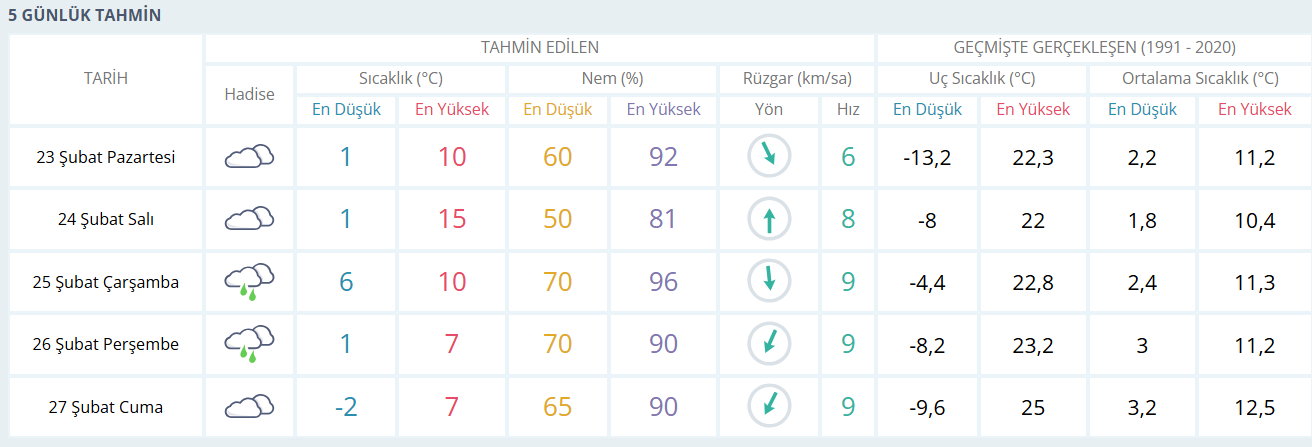 Çarşamba günü ise, 25 Şubat'ta, yağış bekleniyor. Gündüz sıcaklık 10°C civarlarında seyrederken, gece sıcaklık 6°C'ye düşecek. Nem oranı ise yüzde 70 civarında olacak ve rüzgar saatte 9 kilometre hızla esecek. Perşembe günü, 26 Şubat'ta, sıcaklık 7°C'ye kadar düşerken, gece 1°C'ye kadar inmesi bekleniyor. Nem oranı ise yüzde 70 civarında olacak ve rüzgar hızı 9 kilometreye çıkacak. Cuma günü, 27 Şubat'ta ise sıcaklık 7°C civarlarında kalacak. Gece sıcaklık yine -2°C'ye düşecek. Nem oranı yüzde 65 seviyelerinde olacak ve rüzgar saatte 9 kilometre hızla esecek.