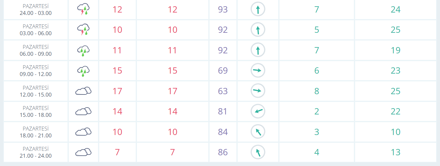 Kent geneli yeni haftaya yağmur ve sağanakla başlayacak ardından sıcaklıklar 11°C'ye çıkacak. Günün ilerleyen saatlerinde, özellikle 09:00-15:00 arasında yağış daha da azalacak, ancak hava bulutlu kalacak.