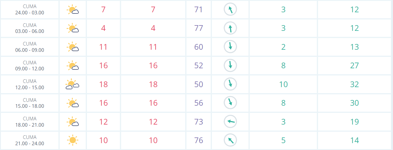 Bursa’da hava, hafta sonuna girerken parçalı bulutlu bir seyir izliyor. Cuma günü gece saatlerinde 7 derece civarında başlayan sıcaklık, sabahın erken saatlerinde 4 dereceye kadar düşüyor. Gün ilerledikçe güneş yüzünü daha fazla gösteriyor ve öğle saatlerinde termometreler 18 dereceyi buluyor. Nem oranı gün içinde düşüş gösterirken rüzgarın zaman zaman hızını artırması hissedilen serinliği biraz daha belirgin kılıyor. Akşam saatlerine doğru sıcaklık yeniden gerileyerek geceye doğru 10 derece civarında seyrediyor.