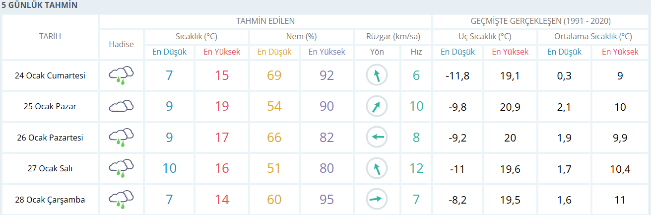 Önümüzdeki beş günlük periyotta Bursa’da yağışlı hava aralıklarla etkisini sürdürüyor. Pazar günü sıcaklık artarak 19 dereceye kadar çıkıyor ve hava çoğunlukla bulutlu geçiyor. Pazartesi günü yeniden yağış beklenirken sıcaklık 17 derece civarında seyrediyor. Salı günü yağmurla birlikte sıcaklık 16 derece dolaylarında kalıyor ve rüzgâr biraz daha hissedilir hale geliyor. Çarşamba günü ise hava yine yağışlı, sıcaklık 14 derece civarında ölçülüyor. Genel olarak hafta boyunca geceler serin, gündüzler ise mevsim normallerine yakın ve yer yer ılık geçecek.