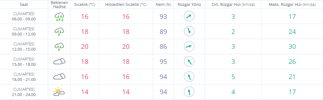 Sabah erken saatlerde sıcaklık 16–17 derece civarında seyrederken, günün ilerleyen saatlerinde 23 dereceye kadar yükselecek. Öğle ve akşam üzeri saatlerinde kısa süreli sağanaklar etkili olacak. Akşam saatlerinde hava sıcaklığı 19 dereceye kadar düşerken, gece ilerleyen saatlerde bulutların dağılmasıyla 16 dereceye kadar gerileyecek.