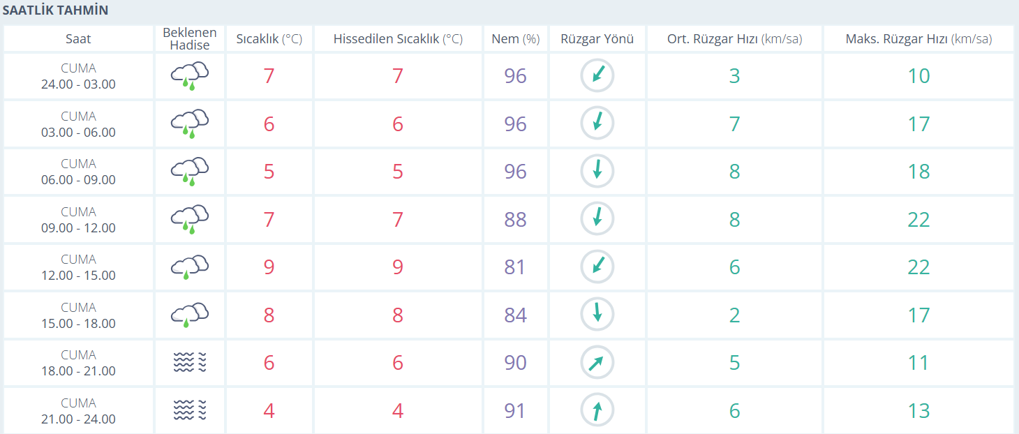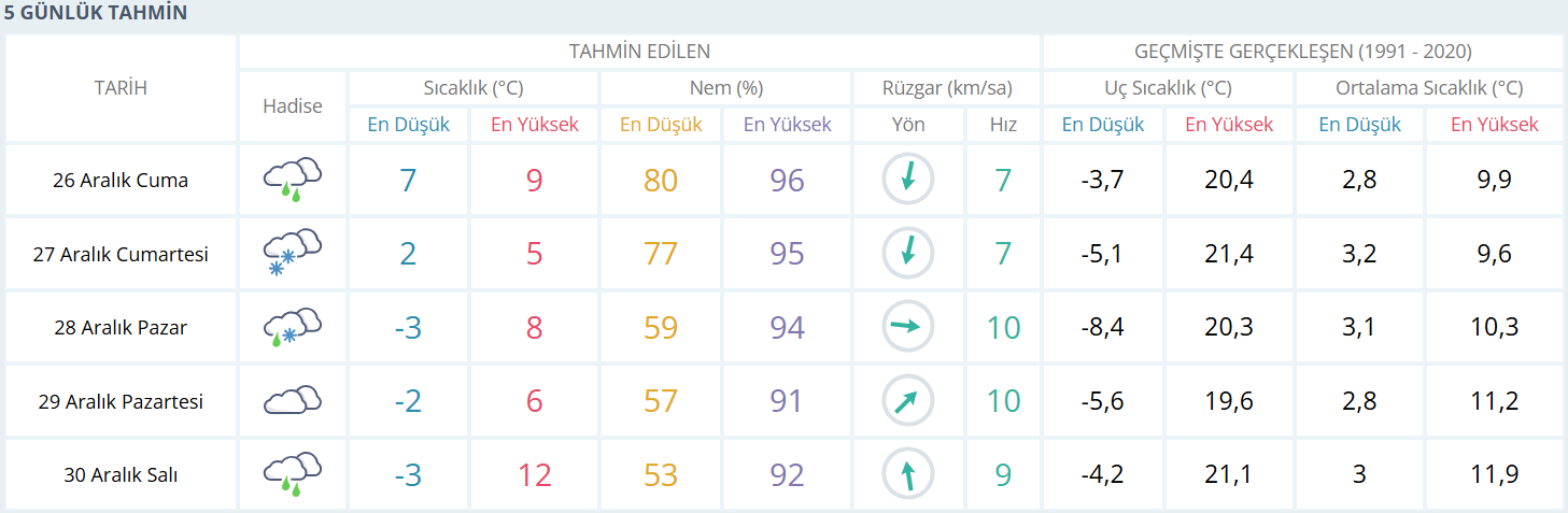 Bursa’da bugün (26 Aralık Cuma) gün boyunca yağışlı ve oldukça nemli bir hava etkili olacak. Gece saatlerinden sabaha kadar aralıklarla devam eden yağmurla birlikte sıcaklık 5–7 derece civarında seyredecek. Sabah saatlerinde serin ve ıslak bir hava hissedilirken, öğleye doğru sıcaklık 9 dereceye kadar çıkacak. Nem oranının gün boyu yüzde 80’in üzerinde olması nedeniyle hava olduğundan daha ağır hissedilecek. Rüzgâr genellikle hafif ve orta kuvvette esecek, akşam saatlerinden sonra sıcaklık yeniden düşerek 4–6 derece seviyelerine inecek. Günün ilerleyen saatlerinde sis ve pus da yer yer etkisini gösterebilir.
