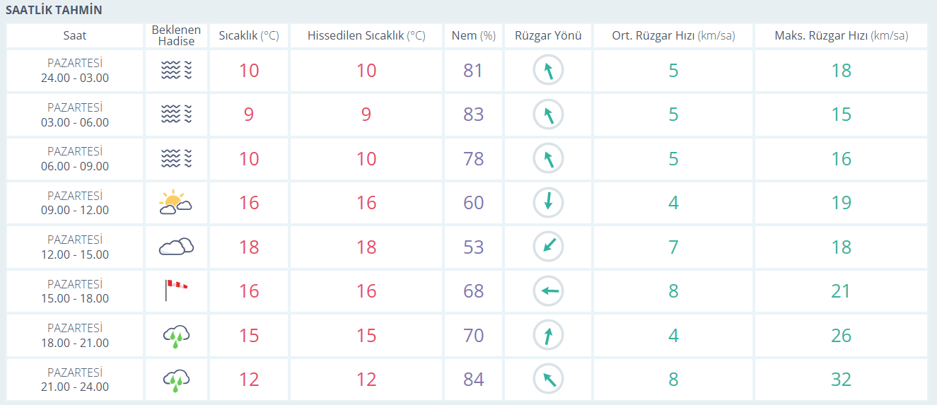 Saatlik tahminlere göre sabahın erken saatlerinde puslu ve nemli bir hava hâkim olacak. Öğleye doğru bulutlar arasında güneş kendini gösterecek ve sıcaklık hızla yükselecek. Öğleden sonra rüzgârın yön değiştirmesiyle birlikte hava yeniden kapatacak, akşam ve gece saatlerinde yağmur tekrar etkili olacak.