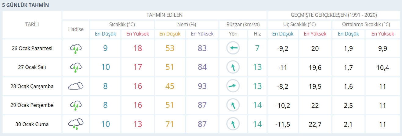 Beş günlük görünüme bakıldığında Bursa’da yağışlı hava hafta boyunca zaman zaman kendini gösterecek. Salı günü sıcaklık 17 derece civarında olacak ve yağmur aralıklarla devam edecek. Çarşamba günü yağış zayıflarken çok bulutlu bir hava bekleniyor, sıcaklık 16 dereceye kadar çıkacak. Perşembe günü yeniden yağmur görülmesi öngörülürken sıcaklıkta önemli bir değişiklik olmayacak. Cuma günü ise yağışların sürmesiyle birlikte en yüksek sıcaklık 13 dereceye kadar gerileyecek.