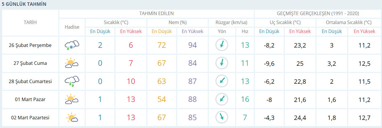 Beş günlük tahmine göre kentte hafta sonuna doğru hava açıyor. Cuma günü parçalı bulutlu bir gökyüzüyle birlikte en yüksek sıcaklık 7 derece olacak. Cumartesi günü kısa süreli yağmur geçişleri görülse de sıcaklık 10 dereceye kadar yükselecek. Pazar günü ise bahar havası kendini hissettirecek; güneşli bir gökyüzü altında termometreler 13 dereceyi gösterecek. Yeni haftanın ilk gününde de benzer bir tablo bekleniyor. Pazartesi günü az bulutlu ve 13 dereceye ulaşan bir hava öngörülürken, gece ve sabah saatlerinde düşük sıcaklıklar nedeniyle buzlanma riskine karşı dikkatli olunması isteniyor.