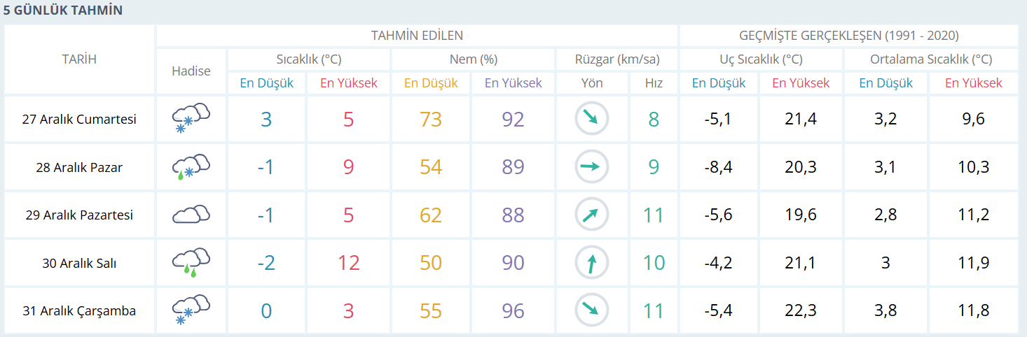 Önümüzdeki beş günlük süreçte Bursa’da dalgalı bir hava bekleniyor. Pazar günü sıcaklıklar belirgin şekilde artarak gündüz 9 dereceye kadar çıkarken, gece saatlerinde sıfırın altına inebiliyor ve yağış geçişleri görülebiliyor. Pazartesi günü daha sakin ve bulutlu bir hava hâkim; sıcaklıklar eksi 1 ile 5 derece arasında seyrediyor. Salı günü ise sıcaklık artışı dikkat çekiyor, gündüz 12 dereceye kadar çıkan hava yer yer yağmurla birlikte daha ılık hissediliyor. Çarşamba günü yeniden soğuma bekleniyor; gündüz sıcaklığı 3 derece civarında kalırken karla karışık yağmur ihtimali gündeme geliyor. Genel olarak hafta boyunca nem oranı yüksek.
