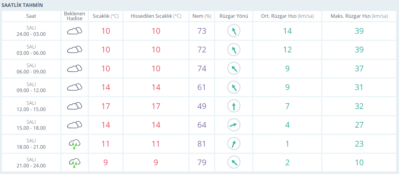 Bugün Bursa’da sabah ve öğle saatlerinde çok bulutlu bir hava hâkim olacak. Günün ilk saatlerinde 10 derece civarında seyreden sıcaklık, öğle saatlerinde 17 dereceye kadar yükselecek. Akşam saatlerinden itibaren ise yağış geçişleri görülecek. Nem oranının gün boyunca yüksek seyretmesi beklenirken, rüzgârın zaman zaman orta kuvvette eseceği tahmin ediliyor.