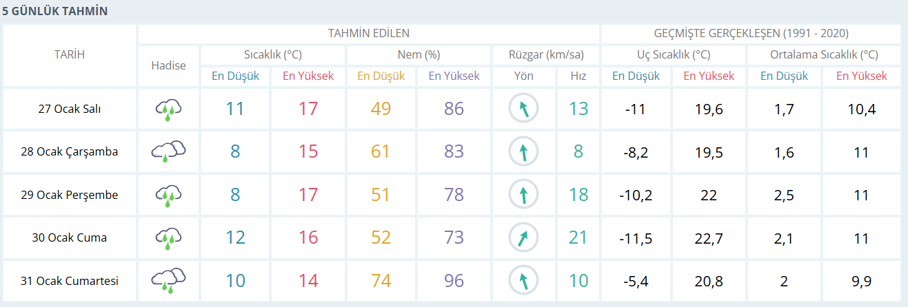 Beş günlük tahmine göre Bursa’da yağışlı hava aralıklarla etkisini sürdürecek. Çarşamba günü sıcaklıkların bir miktar düşmesi beklenirken, en yüksek sıcaklık 15 derece civarında olacak. Perşembe günü ise yeniden ısınan havayla birlikte sıcaklık 17 dereceye kadar çıkacak ve yağış geçişleri görülecek. Cuma günü rüzgârın kuvvetini artırması beklenirken, sıcaklıklar 16 derece seviyelerinde seyredecek. Cumartesi günü ise çok bulutlu ve yer yer yağışlı bir hava öngörülürken, en yüksek sıcaklığın 14 derece olması bekleniyor.
