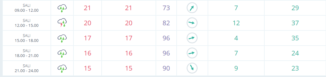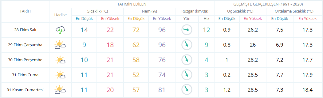 Sabah erken saatlerde sıcaklık 16–17 derece civarında seyrederken, günün ilerleyen saatlerinde 23 dereceye kadar yükselecek. Öğle ve akşam üzeri saatlerinde kısa süreli sağanaklar etkili olacak. Akşam saatlerinde hava sıcaklığı 19 dereceye kadar düşerken, gece ilerleyen saatlerde bulutların dağılmasıyla 16 dereceye kadar gerileyecek.