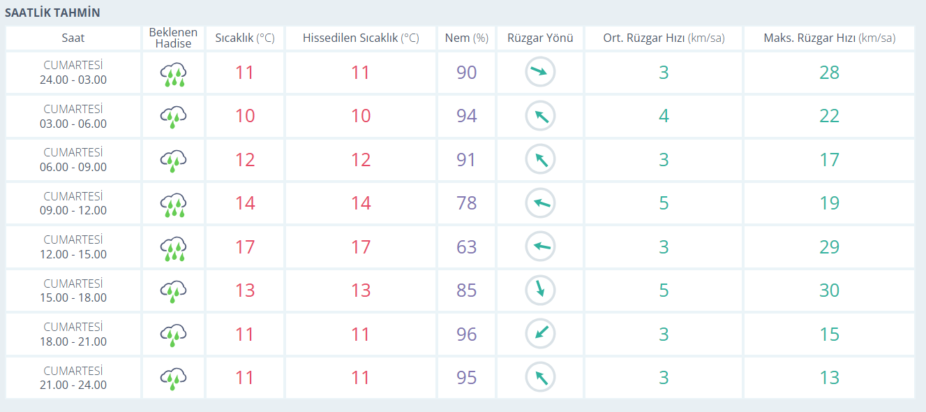 Bursa için meteoroloji verileri, hafta sonuna yağmurla girileceğini gösteriyor. Cumartesi günü kent genelinde aralıklarla etkili olacak yağışla birlikte sıcaklıkların 10 ila 17 derece arasında seyretmesi bekleniyor. Nem oranının oldukça yüksek olduğu günde rüzgar ise hafif eserek 5 km/s civarında kalacak. Saatlik tahminlere bakıldığında gece saatlerinden itibaren başlayan yağışın gün boyunca etkisini sürdüreceği, özellikle sabah ve öğle saatlerinde kısa süreli kuvvetlenmeler görülebileceği ifade ediliyor.