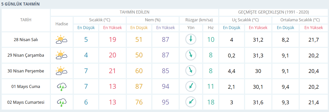 Hafta sonuna doğru ise hava koşullarında belirgin bir değişim yaşanıyor. Cuma ve cumartesi günleri kentte yağışlı sistemin etkili olması beklenirken, sıcaklıklar 13 dereceye kadar geriliyor. Yüksek nem ve zaman zaman etkili olacak rüzgarla birlikte hissedilen sıcaklık daha düşük olacak.