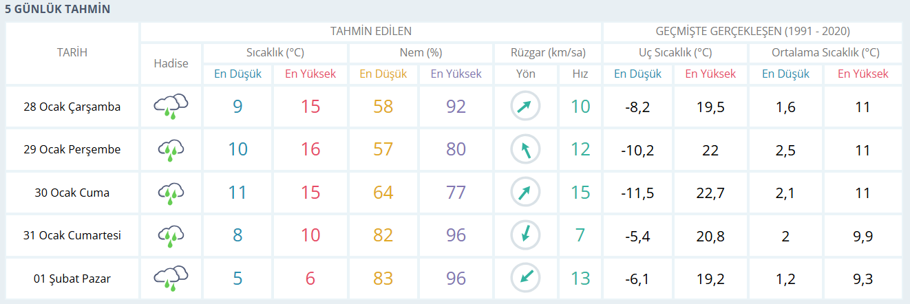 Önümüzdeki beş günlük periyotta da Bursa’da yağışlı ve kapalı hava ağırlığını koruyacak. Perşembe ve cuma günleri yağmur aralıklarla devam ederken sıcaklıklar gündüzleri 15–16 derece bandında seyredecek. Hafta sonuna doğru sıcaklıklarda belirgin bir düşüş bekleniyor; cumartesi günü en yüksek sıcaklık 10 derece civarına inerken, pazar günü 6 dereceye kadar gerileyecek. Nem oranının hafta sonu daha da artmasıyla birlikte hava daha serin ve nemli hissedilecek. Rüzgâr genellikle kuzeyli yönlerden esecek ve zaman zaman hızını artıracak. Genel tabloya bakıldığında Bursa’da önümüzdeki günlerde şemsiyesiz dışarı çıkmamakta fayda var; özellikle hafta sonu serinleyen havaya karşı tedbirli olunması öneriliyor.