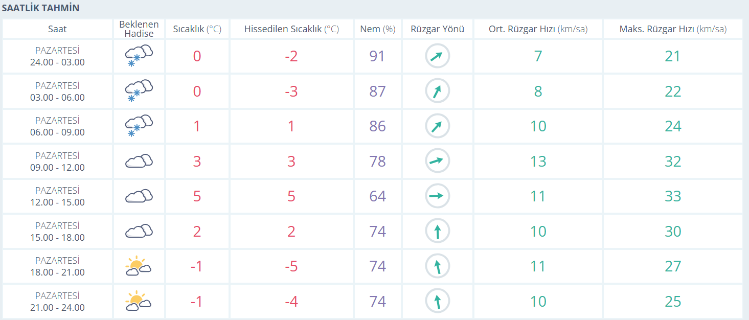 Bursa’da haftanın ilk günü kış koşulları etkisini hissettiriyor. Pazartesi günü gece ve sabah saatlerinde hafif kar yağışı beklenirken sıcaklık 0 derece civarında seyrediyor, hissedilen sıcaklık ise yer yer eksi derecelere düşüyor. Sabah saatlerinden sonra yağış etkisini kaybediyor ve gün genelinde çok bulutlu bir hava hâkim oluyor. Öğle saatlerinde sıcaklık 5 dereceye kadar yükselse de akşam saatlerinden itibaren yeniden soğuma başlıyor.