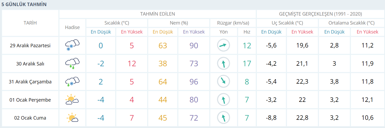 Önümüzdeki beş günlük süreçte Bursa’da hava dalgalı bir seyir izliyor. Pazartesi günü 0 ile 5 derece arasında değişen sıcaklıklarla birlikte karla karışık yağmur öne çıkıyor. Salı günü sıcaklıkların gündüz saatlerinde belirgin şekilde artarak 12 dereceye kadar çıkması beklenirken yağmur etkili oluyor. Çarşamba günü yeniden serinleyen hava ile birlikte yağışın karla karışık yağmur şeklinde görülmesi ve sıcaklığın 2–5 derece aralığında kalması öngörülüyor. Perşembe ve cuma günleri ise yağış azalıyor, parçalı bulutlu ve zaman zaman güneşli bir hava bekleniyor. Bu iki günde gece sıcaklıkları eksi 4 dereceye kadar düşerken gündüz saatlerinde 4 ila 7 derece arasında daha sakin bir kış havası yaşanacağı tahmin ediliyor.