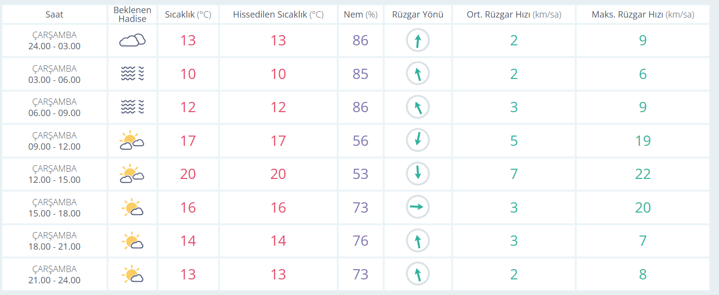 Bursa’da çarşamba günü sabah saatlerine kadar yer yer sis ve pus etkili olacak. Gece sıcaklık 10–13°C civarında seyredecek. Sabah saatlerinden itibaren bulutlar dağılacak ve öğleye doğru hava kısmen açacak.