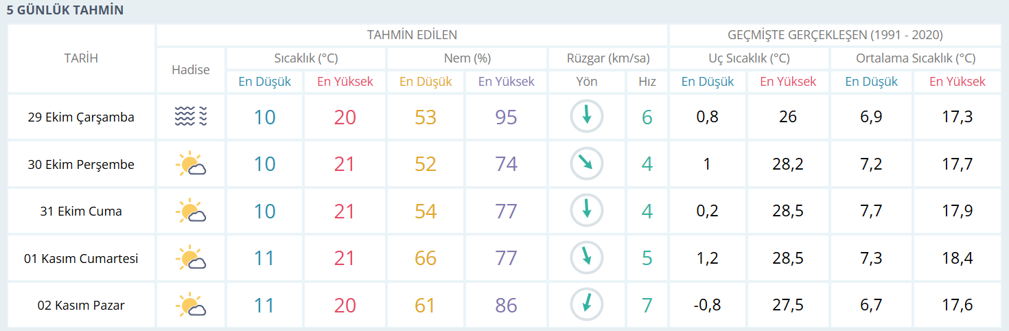 Haftanın geri kalan günlerinde ise güneşli ve az bulutlu hava hakim olacak. 30 Ekim Perşembe ve 31 Ekim Cuma günleri sıcaklık 21°C civarında kalacak; bu iki gün boyunca yağış beklenmiyor. Hafta sonuna doğru sıcaklıklarda önemli bir değişiklik öngörülmezken, 1 ve 2 Kasım günlerinde hava açık ve güneşli olacak. Cumartesi günü sabah saatleri serin, öğle saatleri ise ılık geçecek. Pazar günü ise nem oranında artış gözlenecek ve hava kısmen bulutlanacak.