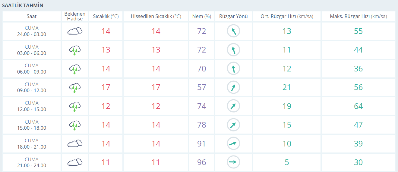 Bursa’da bugün parçalı bulutlu ve aralıklı yağışlı bir hava bekleniyor. Gün içinde sıcaklık 13 ile 17 derece arasında değişirken, nem oranı yüksek seyredecek. Sabah saatlerinden öğleden sonraya kadar yer yer yağmur görülürken, rüzgâr zaman zaman kuvvetini artıracak. Akşam saatlerinde ise yağışın etkisini kaybetmesiyle birlikte sıcaklık düşüşe geçecek.
