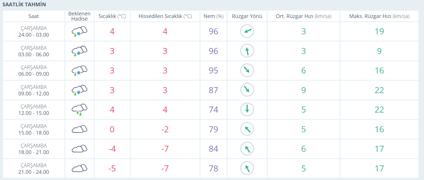 Bursa’da soğuk ve yağışlı hava etkisini sürdürüyor. Saatlik tahminlere göre kentte Çarşamba günü boyunca yağmur ve yer yer karla karışık yağmur görülmesi beklenirken, hava sıcaklığı gün içinde 3–4 derece civarında seyredecek. Öğleden sonra sıcaklık hızla düşerek akşam saatlerinden itibaren sıfırın altına inecek, hissedilen sıcaklık ise yer yer eksi 7 dereceye kadar düşecek. Yüksek nem oranı ve zaman zaman etkisini artıran rüzgarla birlikte özellikle akşam ve gece saatlerinde buzlanma ve don riskine karşı dikkatli olunması gerekiyor.