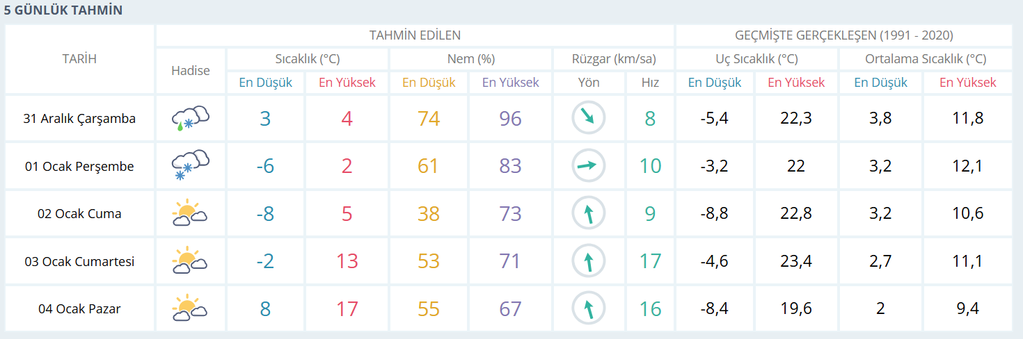 5 günlük hava tahminine göre Bursa’da soğuk hava hafta ortasında etkisini artıracak. Perşembe ve cuma günleri gece sıcaklıklarının eksi 6 ila eksi 8 dereceye kadar düşmesi beklenirken, cuma günü parçalı bulutlu bir hava öne çıkıyor. Hafta sonuyla birlikte sıcaklıklarda belirgin bir artış yaşanacak. Cumartesi günü gündüz sıcaklığı 13 dereceye kadar yükselirken, pazar günü ise 17 dereceyle birlikte daha ılıman ve parçalı bulutlu bir hava bekleniyor. Yeni haftaya girerken Bursa’da soğuk havanın yerini kademeli olarak bahar havasına bırakacağı tahmin ediliyor.