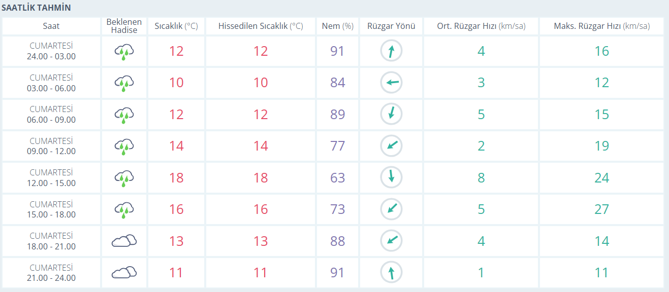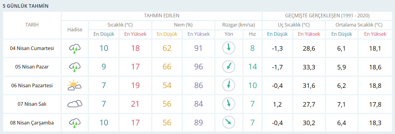 Beş günlük tahmine bakıldığında ise yağışlı sistemin hafta sonu etkisini sürdürdüğü, pazar günü de benzer şekilde yağmur geçişlerinin görüleceği tahmin ediliyor. Yeni haftayla birlikte hava kısmen toparlanıyor; pazartesi günü parçalı bulutlu bir gökyüzü eşliğinde sıcaklıklar 19 dereceye kadar çıkıyor. Salı günü ise yağış beklenmezken sıcaklık 21 dereceye ulaşarak haftanın en yüksek seviyesine çıkıyor. Çarşamba günü yeniden kısa süreli yağış ihtimali belirirken sıcaklıkların 17 derece civarında kalacağı öngörülüyor.
