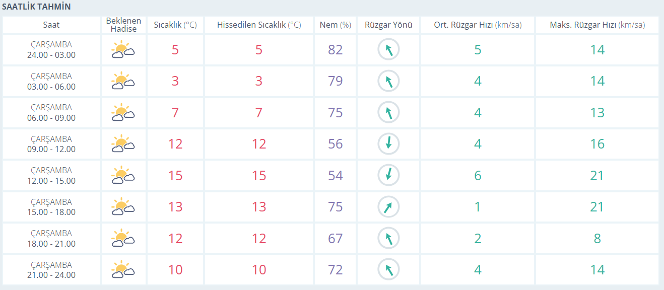 Bursa’da bugün parçalı bulutlu bir hava etkili oluyor. Gece yarısından sabaha karşı saatlere kadar sıcaklık 3–5 derece aralığında seyrederken nem yüksek. Sabah saatlerinden itibaren sıcaklık hızla yükseliyor; öğleye doğru 12 dereceyi bulan hava, günün en sıcak bölümünde 15 dereceye kadar çıkıyor. Rüzgâr gün boyunca hafif ve zaman zaman orta kuvvette, öğle saatlerinde kısa süreli hızlanmalar görülebiliyor. Akşam saatlerinden sonra sıcaklık yeniden düşerek geceye doğru 10 derece civarına iniyor.