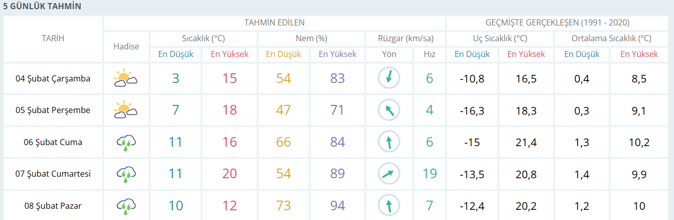 Önümüzdeki beş günlük periyotta Bursa’da sıcaklıklar mevsim normallerinin üzerinde seyretmeye devam edecek. Perşembe günü en yüksek sıcaklık 18 dereceye kadar çıkarken, cuma gününden itibaren yağışlı hava kendini göstermeye başlıyor. Cuma, cumartesi ve pazar günleri aralıklı yağmur bekleniyor. Cumartesi günü hafta içinin en sıcak günü olacak; termometreler 20 dereceyi görebilir. Ancak bu gün rüzgârın da kuvvetlenmesi bekleniyor. Pazar günüyle birlikte sıcaklıklar düşüşe geçerek 12 derece civarına geriliyor. Genel olarak hafta, ılık hava ve hafta sonuna doğru artan yağışlarla geçecek.