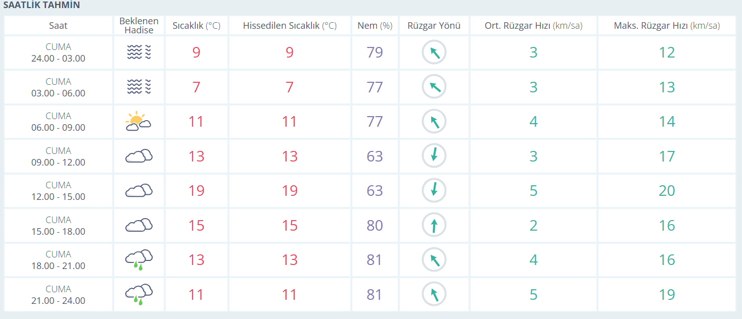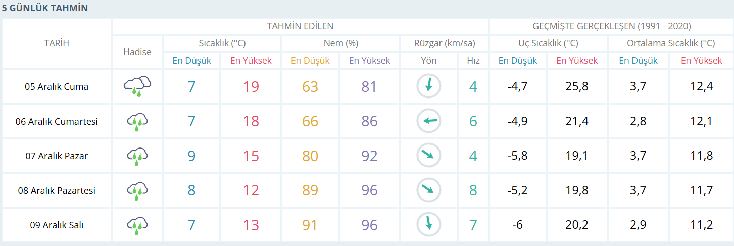 Yarın yani cumartesi günü Bursa’da yine yağışlı bir hava bekleniyor. En düşük sıcaklık 7, en yüksek sıcaklık 18 derece olarak tahmin ediliyor. Pazar günü ise yağış bir miktar hafifliyor ancak tamamen kesilmiyor; sıcaklıkların 9–15 derece aralığında olması bekleniyor.
