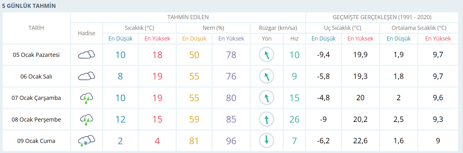 Kentte önümüzdeki 5 günlük süreçte ise hava parçalı ve çok bulutlu olacak. Salı günü sıcaklık 19 dereceye kadar çıkarken, çarşamba günü yağış bekleniyor. Perşembe günü yağışın etkisini artırması ve rüzgârın zaman zaman kuvvetli esmesi öngörülüyor. Cuma günüyle birlikte ise Bursa’da belirgin bir soğuma yaşanacak; sıcaklık gündüz saatlerinde 4 dereceye kadar düşecek. Nem oranının yükselmesiyle birlikte soğuk havanın daha hissedilir olması bekleniyor.