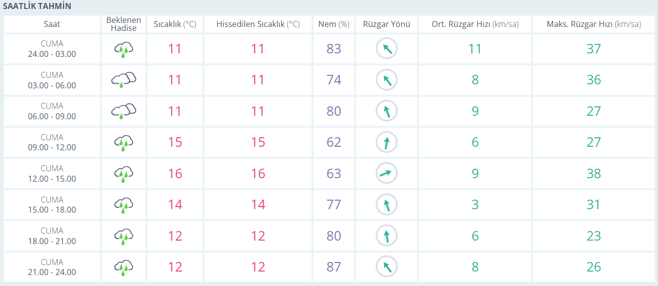 Bursa’da bugün hava gün boyu yağışlı seyrediyor. Gece saatlerinden itibaren etkili olan yağmur, sabah ve öğle saatlerinde de aralıklarla devam ediyor. Sıcaklık gün içinde 15–16 dereceye kadar yükselirken akşam saatlerine doğru 12 derece civarına geriliyor. Nem oranı oldukça yüksek, rüzgâr ise zaman zaman kuvvetlenerek özellikle öğle ve öğleden sonra hissediliyor. Gün genelinde serin, nemli ve kapalı bir hava hakim olacak.