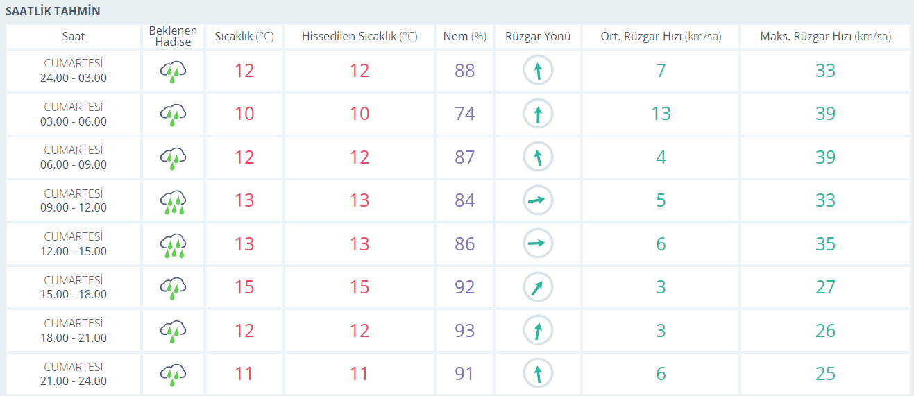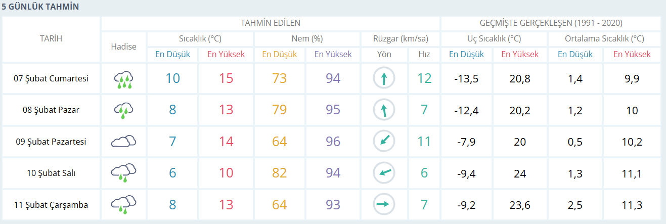 Pazar günü de yağış Bursa’yı terk etmiyor. En düşük sıcaklığın 8, en yüksek sıcaklığın ise 13 derece olması beklenirken nem oranı oldukça yüksek seyredecek. Pazartesi günü yağış yerini çok bulutlu bir havaya bırakacak, sıcaklık 7 ila 14 derece arasında olacak. Salı günü yeniden yağmur beklenirken sıcaklıklar biraz daha düşerek 6 ila 10 derece aralığında seyredecek. Çarşamba günü ise parçalı ve çok bulutlu, yer yer yağışlı bir hava öngörülüyor; sıcaklıklar yeniden 8 ila 13 dereceye çıkacak.