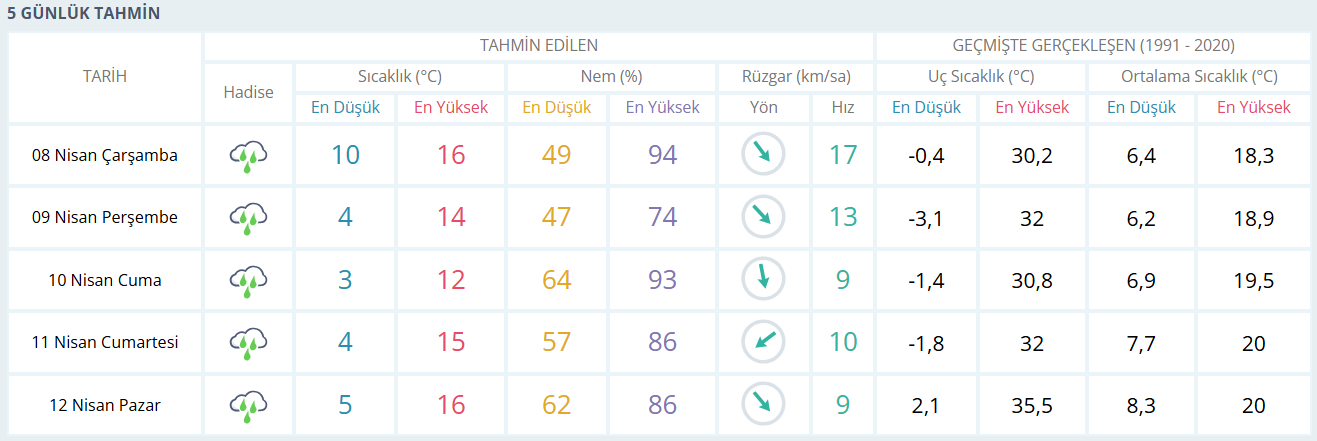 Beş günlük görünüme bakıldığında ise Bursa’da yağışlı hava birkaç gün daha etkisini sürdürecek. Perşembe ve cuma günleri sıcaklıklar düşüşe geçerken, gece değerlerinin 3–4 dereceye kadar gerilemesi bekleniyor. Hafta sonuna doğru ise sıcaklıklarda yeniden artış görülecek. Cumartesi ve pazar günleri en yüksek sıcaklıkların 15–16 derece bandına çıkacağı tahmin edilirken, yağışın yer yer devam edeceği öngörülüyor.
