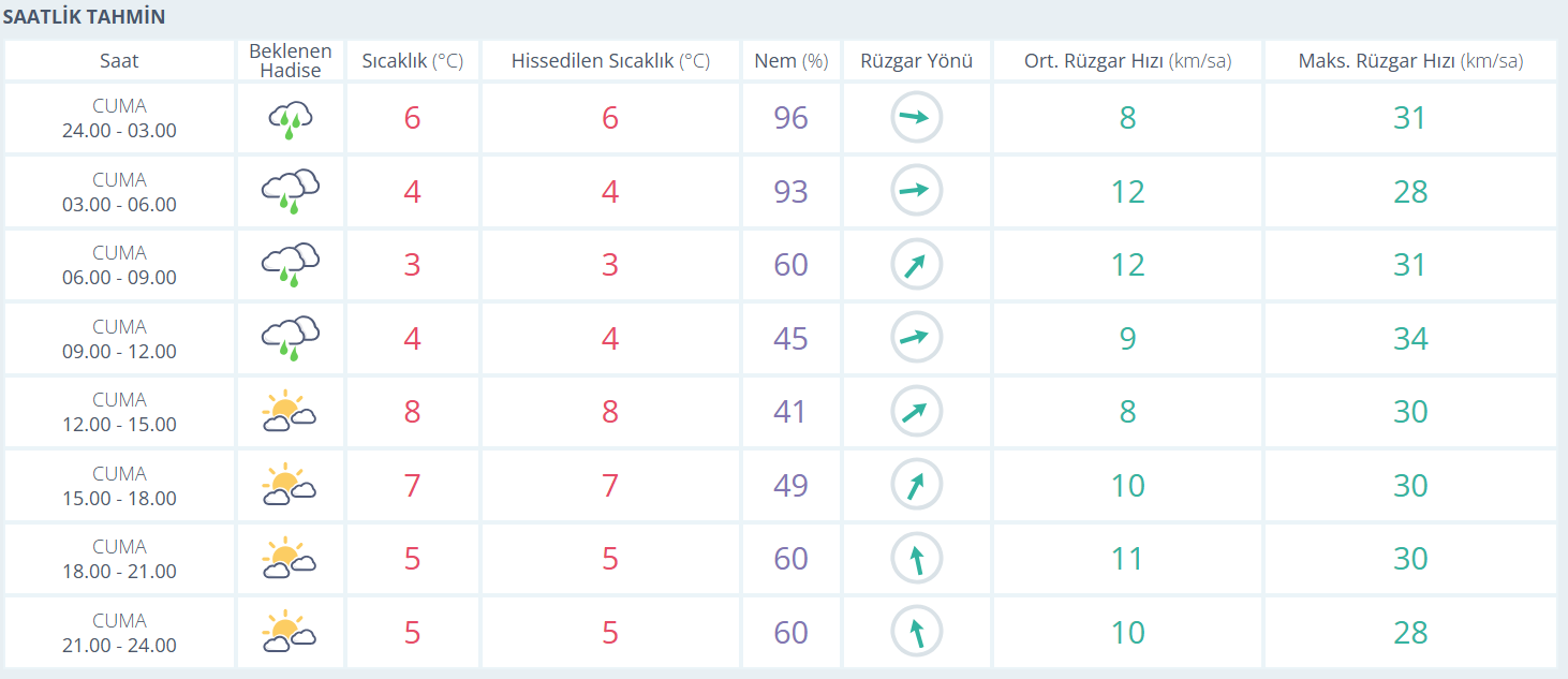 Bursa’da bugün hava sabah saatlerinden itibaren yağışlı bir seyir izliyor. Gece yarısından sonra başlayan yağmur, sabahın erken saatlerine kadar etkisini sürdürüyor. Sabah saatlerinde sıcaklık 3–4 dereceye kadar gerilerken nem oranı oldukça yüksek. Öğleye doğru yağış zayıflıyor ve parçalı bulutlu bir hava hakim oluyor. Günün en yüksek sıcaklığı 8 derece civarında ölçülürken, öğleden sonra ve akşam saatlerinde hava yeniden serinliyor.