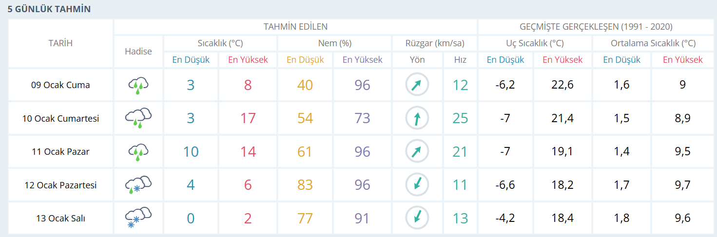 Önümüzdeki beş günlük periyotta Bursa’da değişken ve yağışlı bir hava öne çıkıyor. Cumartesi günü sıcaklık belirgin şekilde yükselerek 17 dereceye kadar çıkıyor ancak yağış geçişleri devam ediyor ve rüzgâr kuvvetini artırıyor. Pazar günü hava yine yağışlı, sıcaklık 10–14 derece aralığında seyrediyor. Yeni haftanın ilk günü sıcaklık yeniden düşüşe geçiyor; pazartesi günü en yüksek sıcaklık 6 derece civarında kalırken yağışın yer yer kış karakteri göstermesi bekleniyor. Salı günü ise soğuk hava daha belirgin hale geliyor, sıcaklık 0 ile 2 derece arasında seyrediyor ve karla karışık yağmur ihtimali artıyor.