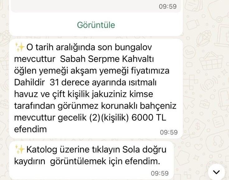 Olay, Antalya'da yaşayan genç bir kadının arkadaşına doğum günü sürprizi yapmak istemesiyle başladı. Hafta sonunu arkadaşıyla birlikte geçirmek isteyen kadın, sosyal medyada gördüğü bungalov ilanı üzerinden iletişime geçti. Hesap yöneticisi tarafından WhatsApp'a yönlendirilen mağdura, tesise ait olduğu belirtilen profesyonel görseller ve konaklama detayları gönderildi.