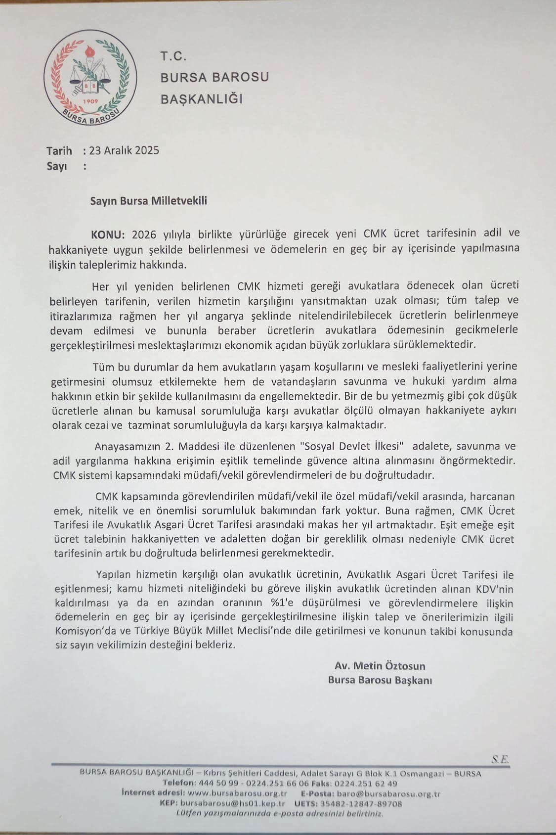 "Her yıl yeniden belirlenen CMK hizmeti gereği avukatlara ödenecek olan ücreti belirleyen tarifenin, verilen hizmetin karşılığını yansıtmaktan uzak olması; tüm talep ve itirazlarımıza rağmen her yıl angarya şeklinde nitelendirilebilecek ücretlerin belirlenmeye devam edilmesi ve bununla beraber ücretlerin avukatlara ödemesinin gecikmelerle gerçekleştirilmesi meslektaşlarımızı ekonomik açıdan büyük zorluklara sürüklemektedir.