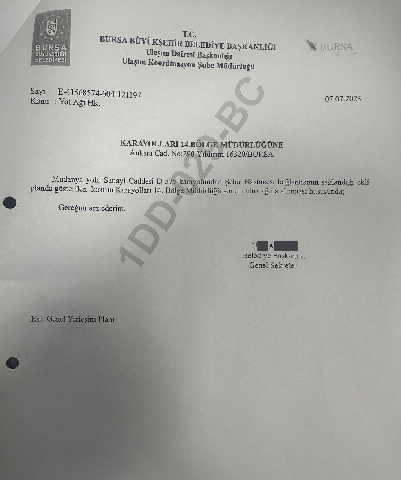 07.07.2023 tarihli yazı: Belediye Başkanlığı tarafından Karayolları Genel Müdürlüğü’ne resmi olarak bağlantı yolunun alınması talebi yapılmıştır.