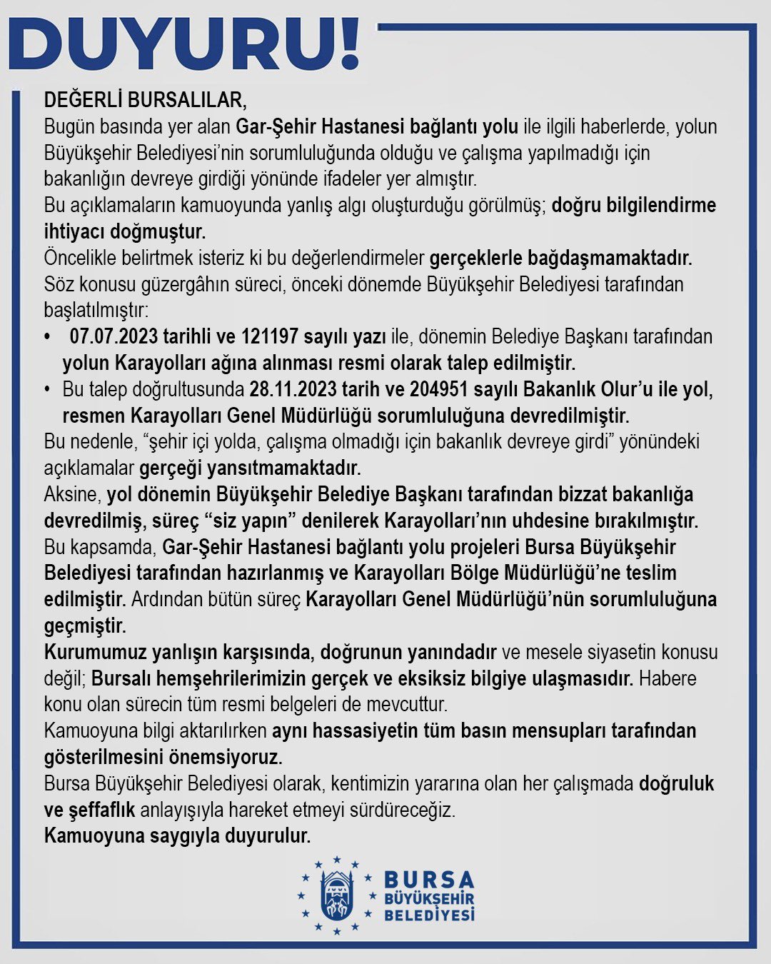 Bursa Büyükşehir Belediyesi, bugün basında yer alan Gar-Şehir Hastanesi bağlantı yolu ile ilgili haberlerin gerçeği yansıtmadığını ve yolun belediye sorumluluğunda olmadığına dair bir duyuru yaptı. Belediye tarafından yapılan açıklamada, bazı basın organlarında yer alan "Büyükşehir Belediyesi'nin sorumluluğunda olan yolun bakanlığa devredilmesi" yönündeki ifadelerin yanlış olduğu belirtilmiştir.