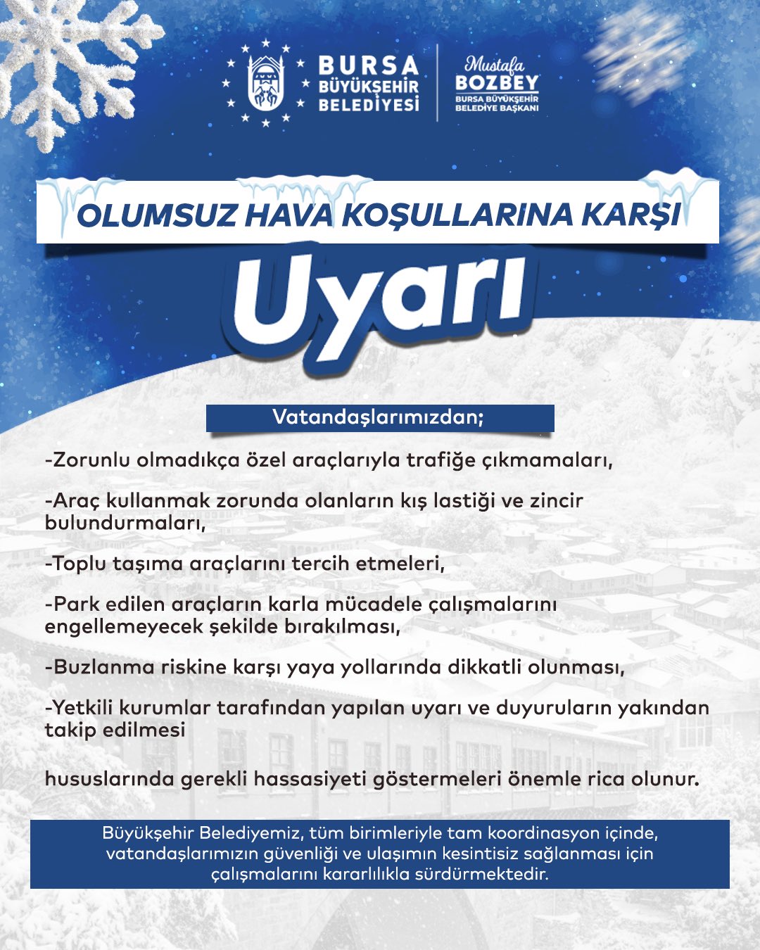 Bursa Büyükşehir Belediyesi, tüm birimleriyle tam koordinasyon içinde çalışmalarını sürdürdüğünü belirterek, vatandaşların güvenliği ve ulaşımın kesintisiz sağlanması için kararlılıkla sahada olunacağını bildirdi.