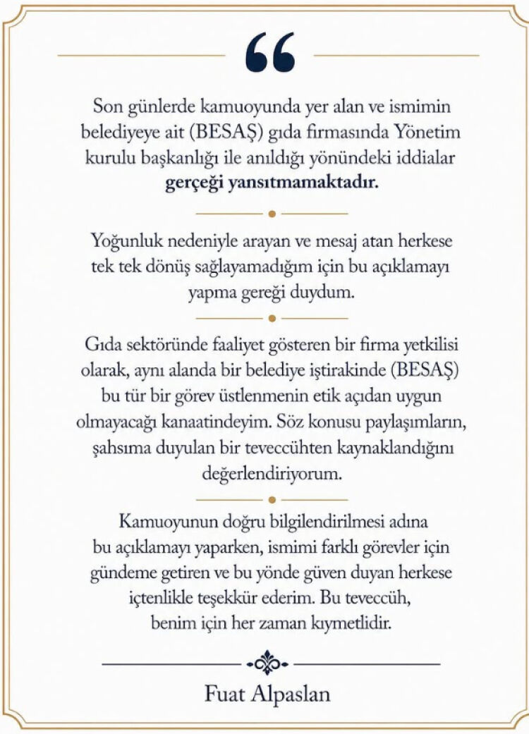 Alparslan, isminin BESAŞ Yönetim Kurulu Başkanlığı ile anılmasının gerçeği yansıtmadığını belirtti.