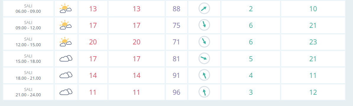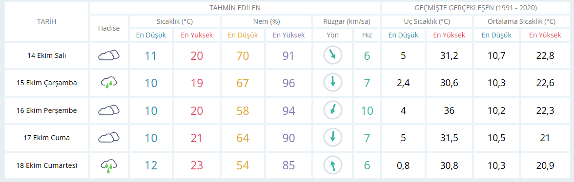 14 Ekim Salı (bugün), hava parçalı bulutlu olacak. Gündüz sıcaklığı 20°C'yi bulacak, ancak gece 11°C'ye kadar düşecek. Nem oranı %71 ile %96 arasında değişecek. Güneydoğudan esen rüzgar saatte 7 km hızla esecek.