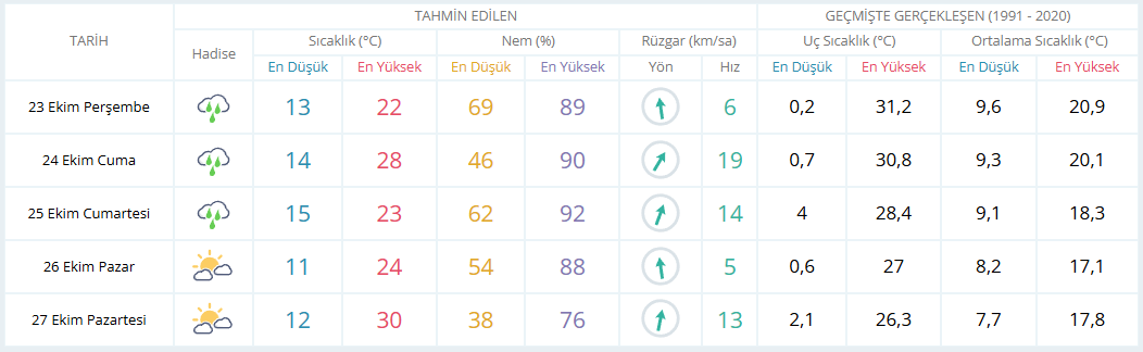 Yağış, 24 Ekim Cuma günü de sürecek. Cuma günü hava sıcaklığı 28 dereceye kadar çıkarken nem oranı yüzde 90’a ulaşacak.