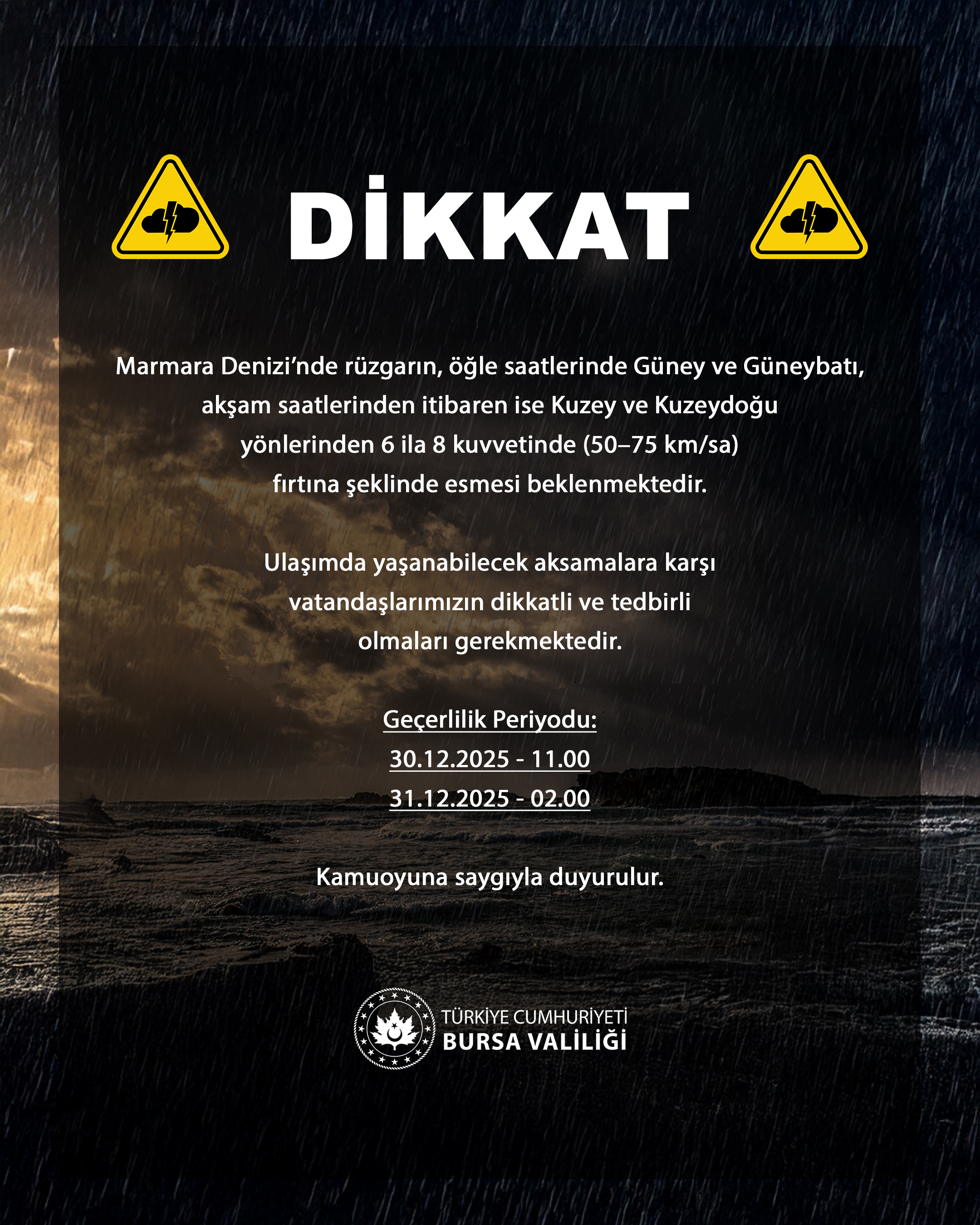Bursa Valiliği, olumsuz hava koşullarına karşı kamuoyunun dikkatli ve tedbirli davranmasını istedi.