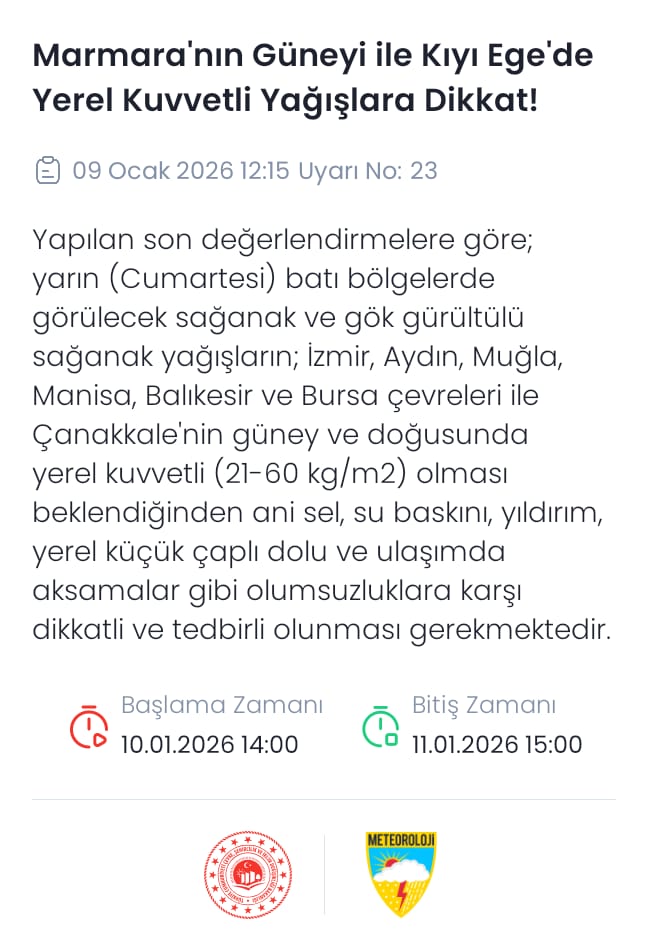 Uyarının 10 Ocak Cumartesi günü saat 14.00’te başlayacağı, 11 Ocak Pazar günü saat 15.00’e kadar etkisini sürdüreceği bildirildi. Özellikle dere yataklarına yakın bölgelerde yaşayan vatandaşların ve sürücülerin dikkatli olması istendi.
