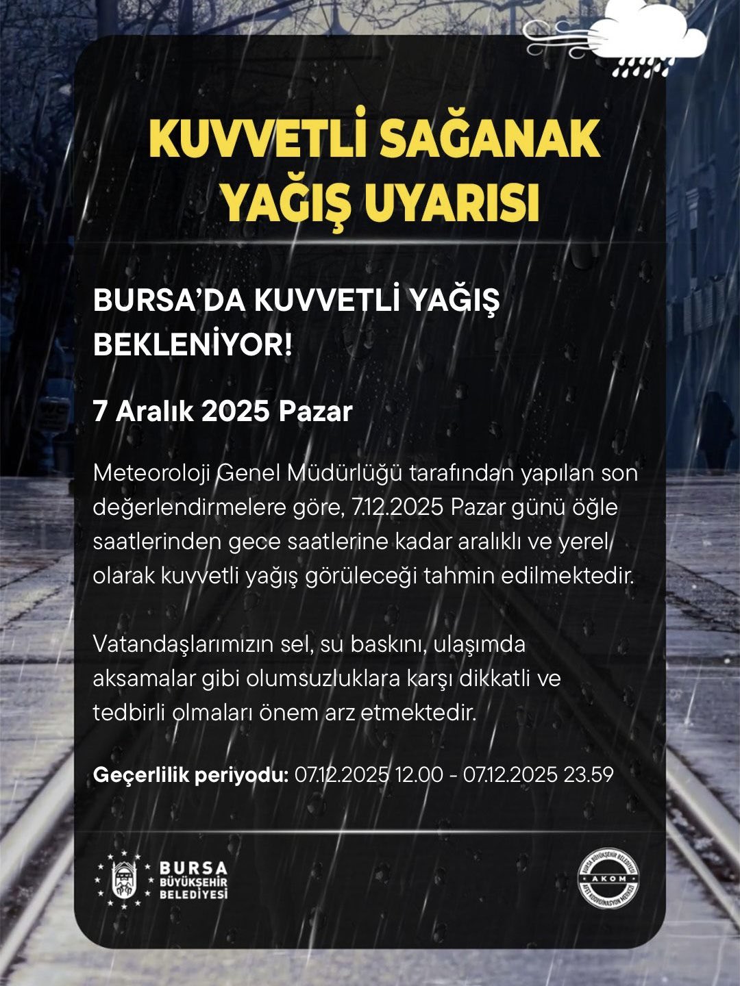 Bursa Büyükşehir Belediyesi, vatandaşları özellikle sel, su baskını ve ulaşımda aksamalar gibi olası olumsuzluklara karşı dikkatli ve tedbirli olmaları konusunda uyardı.